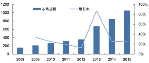 2008-2015年中國第三方檢測市場規(guī)模及增長趨勢(單位:億元)