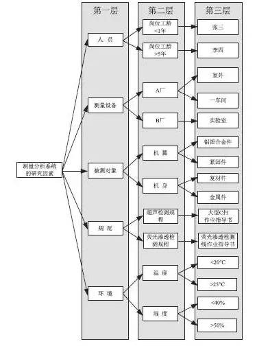 無損檢測測量系統(tǒng)分析系統(tǒng)的建立應當充分評估以識別所有可能影響結(jié)果的因素。如圖4所示,在民機產(chǎn)業(yè)常常采用三層樹狀圖來分析相關(guān)因素。