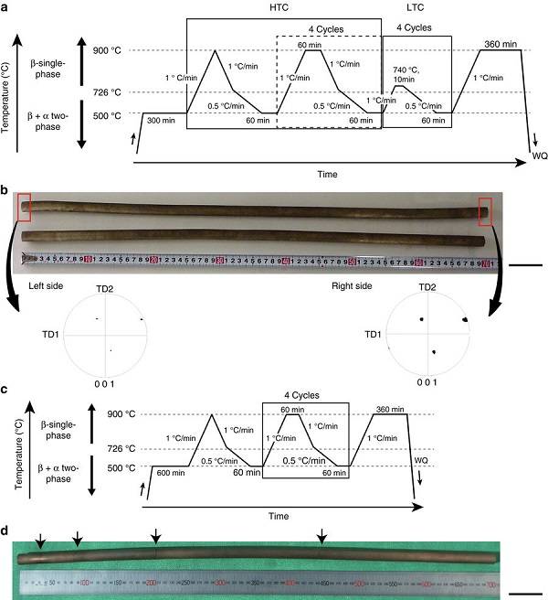 b.循環(huán)熱處理工藝制備的銅-鋁-錳單晶棒