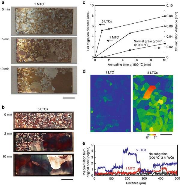 b.多次低溫循環(huán)熱處理(740/500℃)后,由于亞晶粒之間取向差增大,因此亞晶界能升高,晶界遷移速率增大,為超大晶粒的實(shí)現(xiàn)提供可能