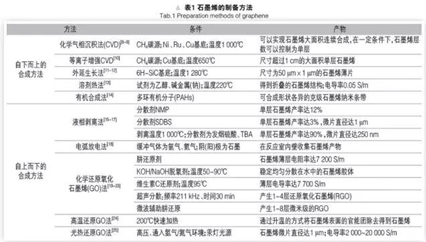 自從Andre Geim和Konstantin Novoselov于2004年首次采用“微機(jī)械分離法”獲得石墨烯以來,已有很多方法被用來制備石墨烯。這些制備方法按制備思路可以分為兩大類:(1)自下而上地在限定的基底上利用小分子碳源原位生長出石墨烯;(2)自上而下地以石墨為原料,橫向剝離,如機(jī)械剝離法、液相剝離法和氧化還原法等。其具體制備方法如表1所示。
