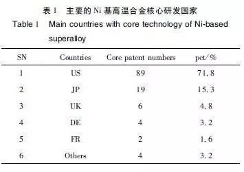 有關Ni基高溫合金的核心專利技術自出現以來一直在持續(xù)地發(fā)展,主要的技術擁有國美國和日本在這一技術領域的研發(fā)活動和產出也比較多,另外德國、英國、法國等國家也是主要的核心技術擁有者(見表1)。