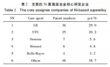 美國通用電氣公司(GE)和聯合技術公司(UTC)是其中的主要核心專利權人,其擁有的核心技術專利占到整個核心專利的近一半,另外德國西門子(Siemens)、美國豪梅公司(Howmet)、英國羅-羅公司(Rolls-Rayce)、日本產業(yè)技術研究所、美國克珞美瑞燃氣渦輪有限公司、特殊金屬公司等也具有相當的技術實力(見表2)。