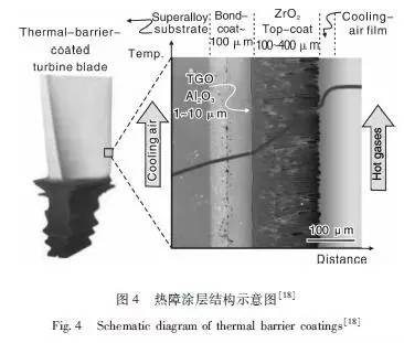 熱障涂層技術是美國NASA中心提出的,將耐高溫、高隔熱的陶瓷材料涂覆在合金基體表面,作用是降低合金表面溫度,可以讓合金在更高溫度下工作。英國羅羅公司為了提升發(fā)動機的耐高溫能力,早在1960年開始試驗隊發(fā)動機進行冷卻的技術,使得發(fā)動機的抗高溫能力大幅提升;20世紀90年代開始出了冷卻技術外,又研發(fā)出了熱障涂層技術,發(fā)動機的抗高溫性能進一步提升(圖3)。一般情況下,熱障涂層在100~500微米厚,可以降低合金表面溫度100℃~300℃甚至更高,第4代Ni基高溫合金本身大約可以耐高溫1180℃,但在熱障涂層存在下可以使渦輪發(fā)動機在1300℃以上環(huán)境中工作,從而大大提高發(fā)動機的效率和性能。