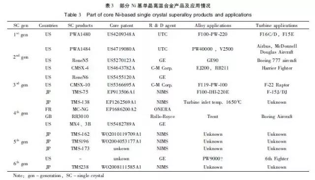 Ni基高溫合金核心專利產品包含采用熔煉、鑄造和單晶等技術生產的產品,其中單晶產品代級間在耐高溫性能上高出30~60℃。第2代產品開始含有一定比例的Re;第4代產品含有一定比例的Ru;第5代產品通過添加Si改善合金的抗氧化性能,同時增加了Ru的含量,Ta被置換出來維持γ/γ微觀結構;第6代產品處Ru,Re的其他Pt族金屬的地位得到提升。據報道,已經研發(fā)第6代Ni基單晶高溫合金技術的主要是日本NIMS和美國GE。日本NIMS重視材料的綜合性能、環(huán)保性能,Ru的含量達到5.0%,其中高溫環(huán)境下的抗氧化性相對更重視,報道的合金產品型號為TMS-238。美國GE提升了其他Pt族金屬在合金中的含量,據報道含量從0.1%~6.0%,具體產品名稱未見報道。表3列出了部分Ni基單晶高溫合金及其應用情況。