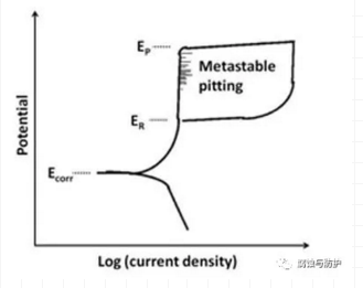 這幅圖顯示了循環(huán)極化曲線,用于評估點(diǎn)蝕腐蝕??梢钥闯龈〉腅R和更大的亞穩(wěn)態(tài)點(diǎn)蝕環(huán)更易受到點(diǎn)蝕的影響。