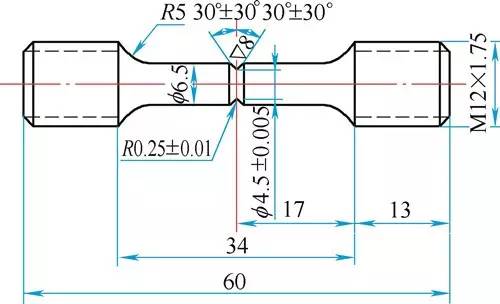 3、試樣的制造。按圖沿材料的順纖維方向加工試樣,粗加工后熱處理至所要求的抗拉強度,然后精加工至規(guī)定尺寸,缺口用中軟細粒氧化鋁砂輪磨制。磨削時應(yīng)保證缺口根部半徑圓滑。磨削后投影檢查,確保缺口尺寸符合圖紙要求。逐根測量缺口根部直徑(圖中為φ4.5±0.05mm)的尺寸,并做好編號記錄。